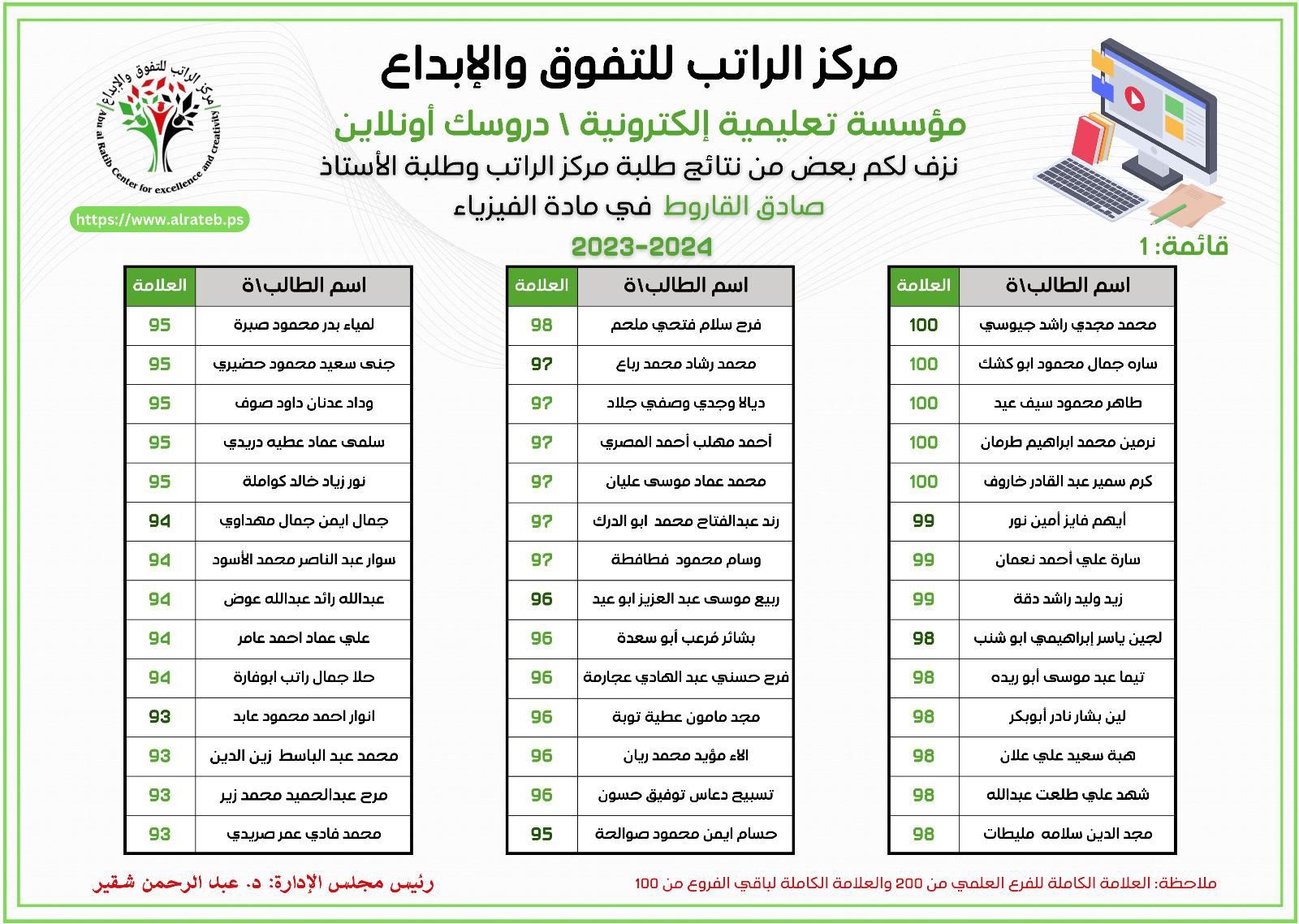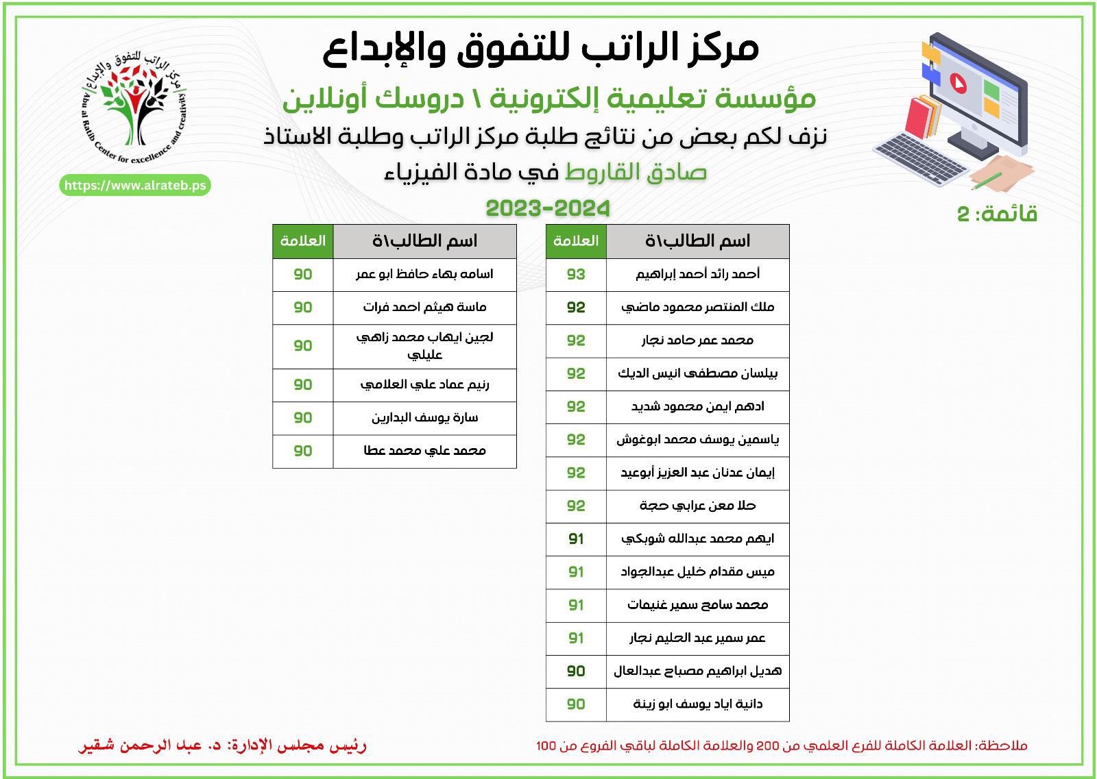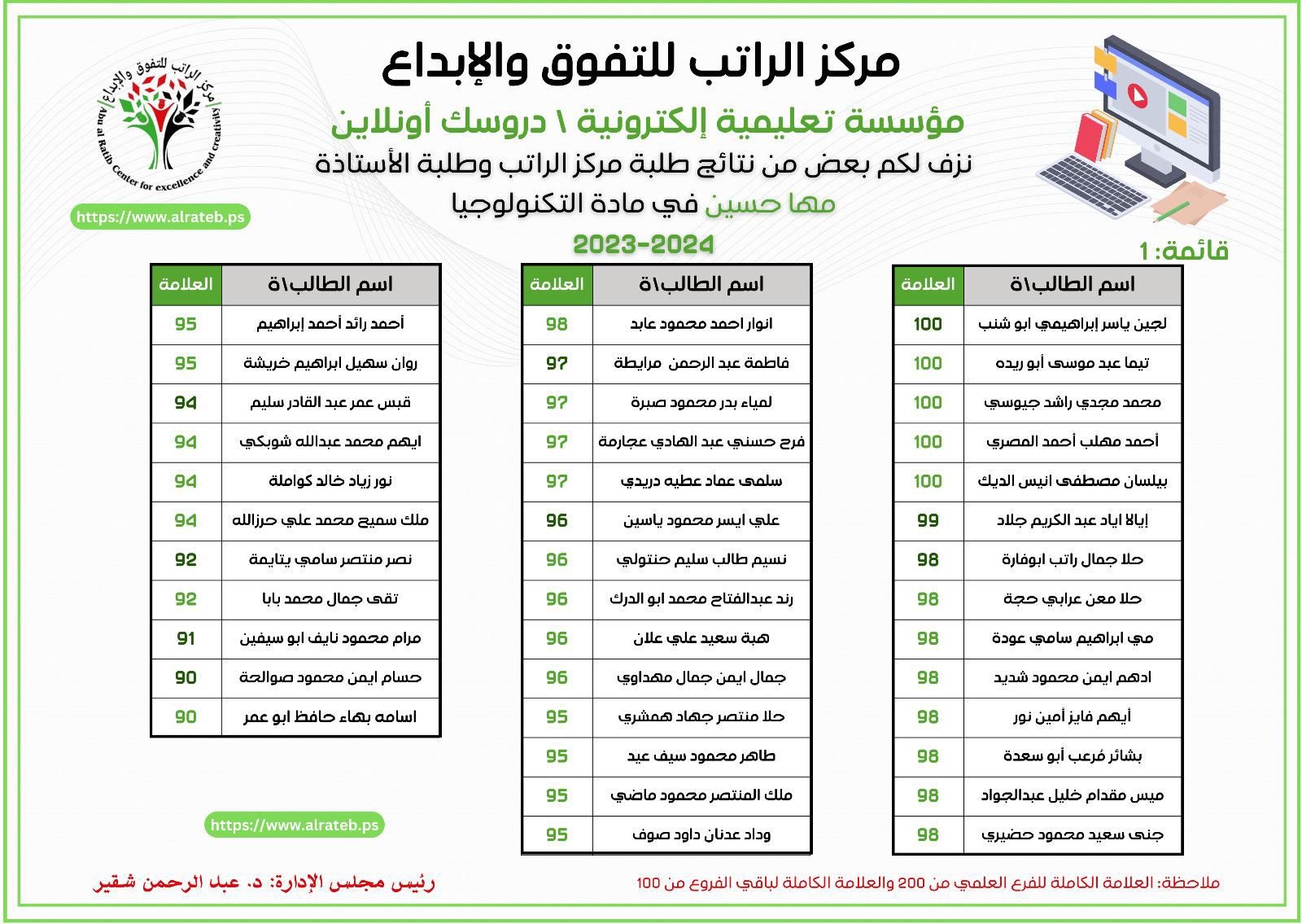 لوحة الشرف لمادة التكنولوجيا 2023-2024