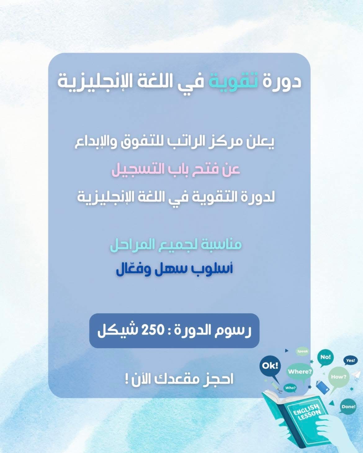 الدورة بـ250 شيقل وبتشمل مهارات، قواعد، ومفردات بأسلوب سهل وفعّال.